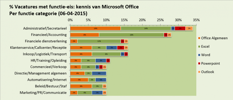 Wij hebben recentelijk onderzocht binnen hoeveel vacatures er kennis van Microsoft Office applicaties een vereiste is. Daaruit bleek dan 10% van alle vacatures deze vereiste had opgenomen in het functieprofiel. Natuurlijk zijn er meerdere soorten functies waarbij deze kennis meer of juist minder relevant is. Veelal wordt er in ieder geval kennis van Excel en of Word gevraagd afhankelijk van de functie. Bekijk de afbeelding onderaan deze pagina om te zien hoeveel vraag er naar Office kennis is binnen jouw branche.
